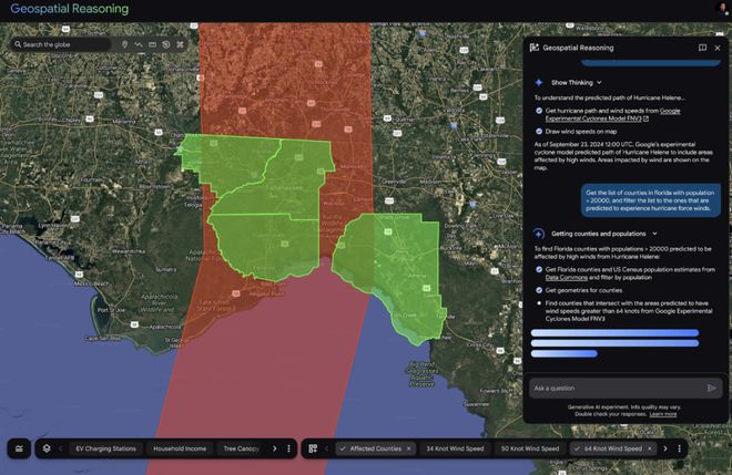 Google Earth AI encompasses a series of geospatial AI models and datasets, including a geospatial reasoning model powered by Gemini. This model can automatically connect different Earth AI models—such as weather forecasting, population maps, and satellite imagery—and answer various questions.